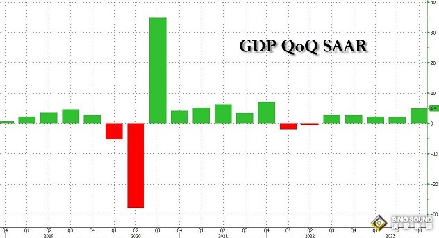 10月26日,根據美國經濟分析局發佈的初步估算,美國2023年第三季實際國內生產總值(GDP)經季調環比年化增長率為4.9%,前值為2.1%。此前,市場預計,美國第三季度GDP將增長4.3%。